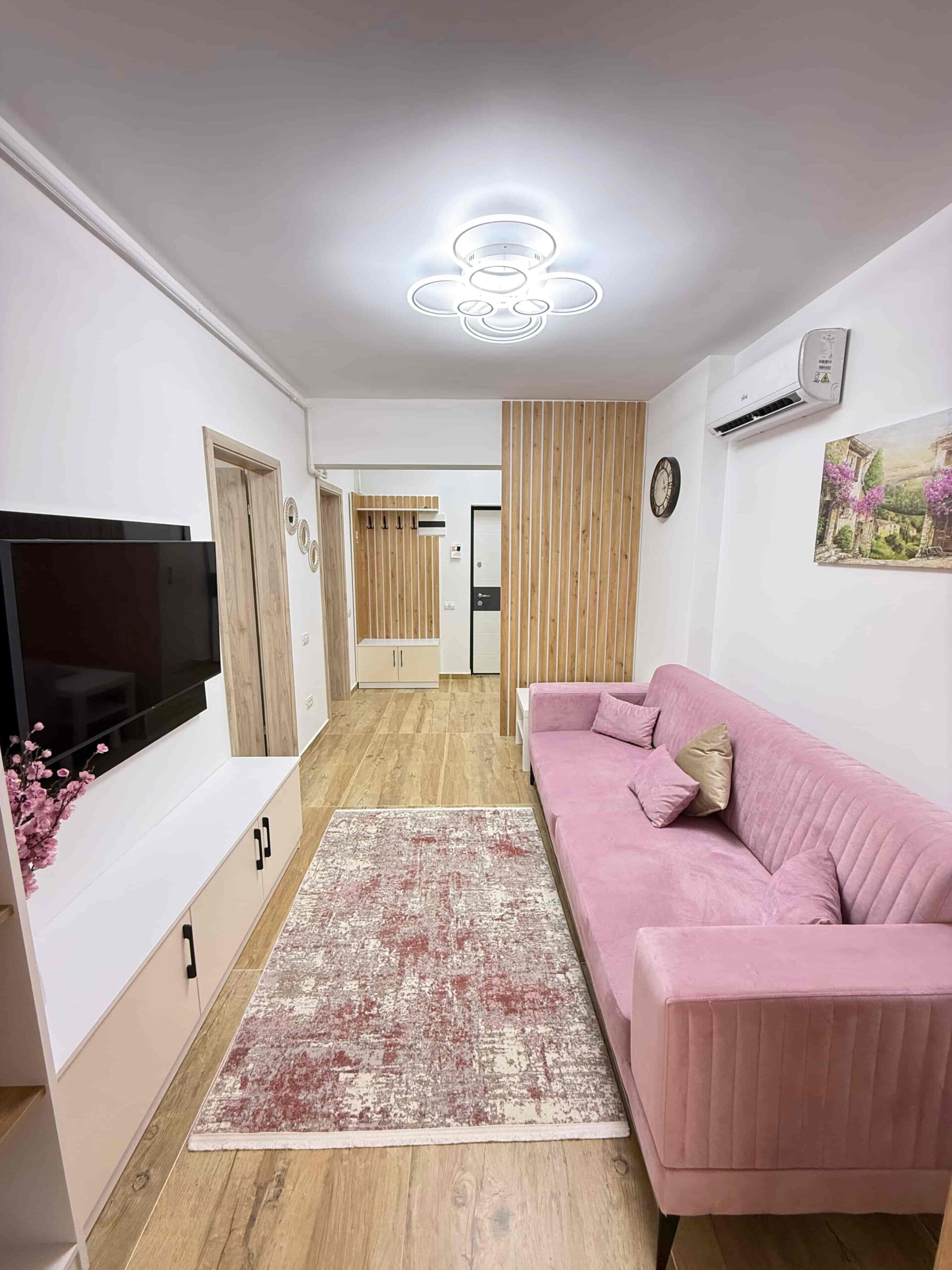 Decorul este gândit cu grijă – culori neutre, accente elegante, canapele din catifea, perne decorative și dormitoare spațioase cu paturi matrimoniale confortabile. Televizoare smart sunt deja instalate în fiecare locuință.
