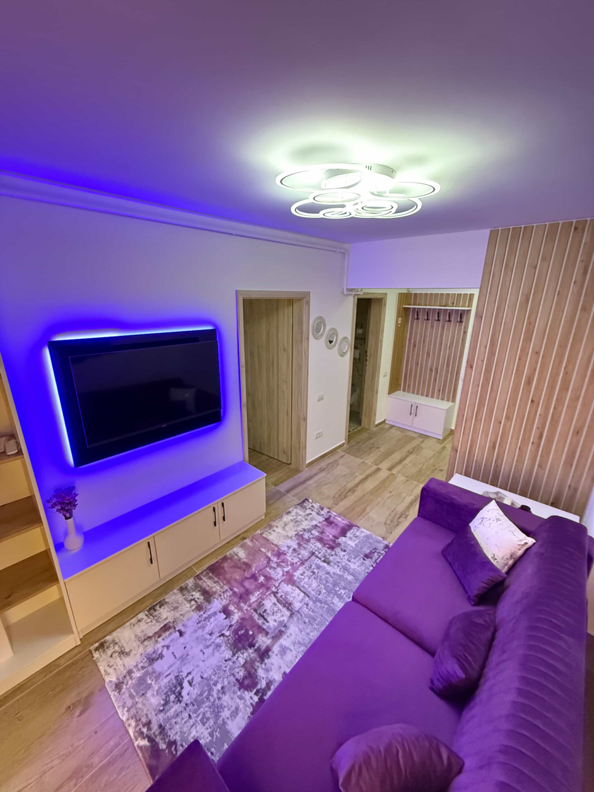 Apartamentul are două camere spațioase, mobilate cu gust, într-un stil actual. Livingul te întâmpină cu o canapea din catifea mov, perne decorative și televizor smart. Dormitorul este dotat cu un pat matrimonial confortabil, dressing mare și iluminare caldă, perfectă pentru un somn liniștit.